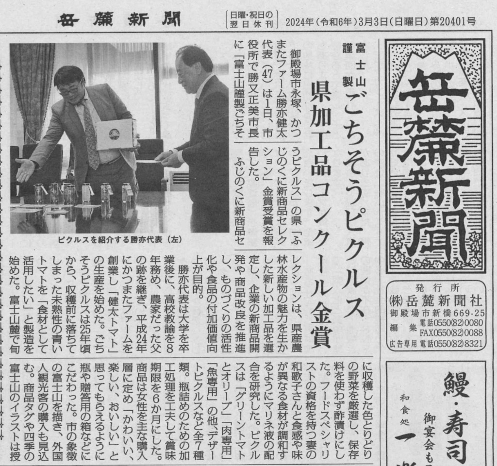 ふじのくに新商品セレクション、金賞を受賞いたしました。