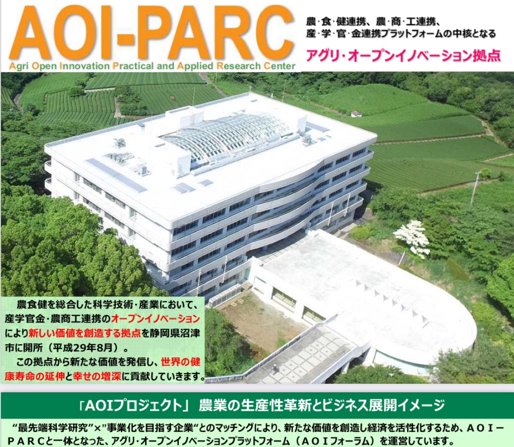 農業生産者、技術者、科学者を繋ぐハブとして機能するのが、AOIPARCおよび、AOIフォーラム。本事業参画者の多くはAOIプロジェクトに参画する事業者たち。AOIとは、「アグリ•オープン•イノベーション」を指す。